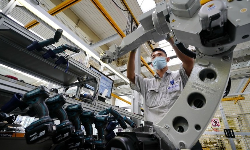Công nhân trong một nhà máy ở Đường Sơn (Hà Bắc, Trung Quốc) điều chỉnh robot hàn. Ảnh: Tân Hoa Xã