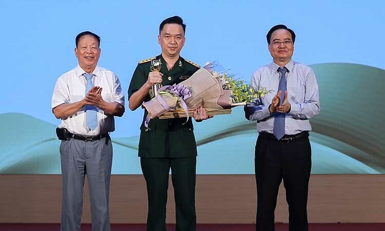Bộ trưởng Bộ Giáo dục và Đào tạo Phụng Xuân Nha (phải) và đại diện Tập đoàn Baosong (trái) được trao cho Phó giáo sư Hồ Anh Sơn thuộc Viện Hàn lâm Khoa học Quân y.